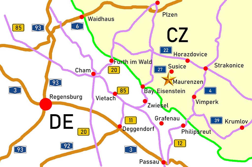 Sie fahren auf der Straße 190 bis Hartmanice und biegen an der Kreuzung rechts in die Straße 145 nach Susice ab. Nach genau 1,2km biegen sie rechts ab nach Palvinov. Oben in Palvinov müssen sie beim Gutshof scharf links abbiegen.